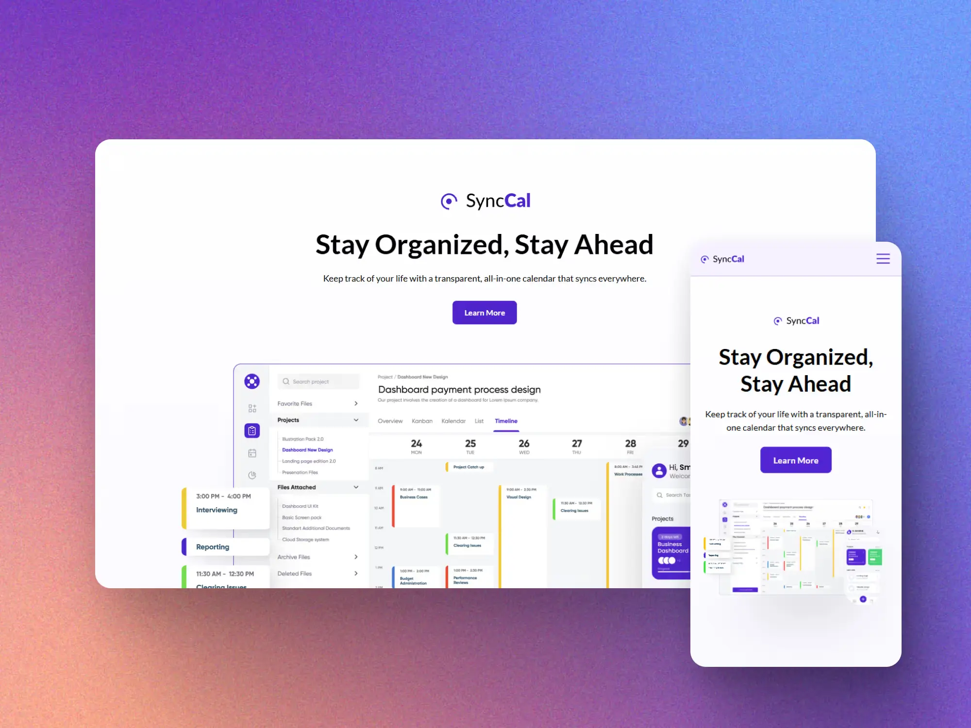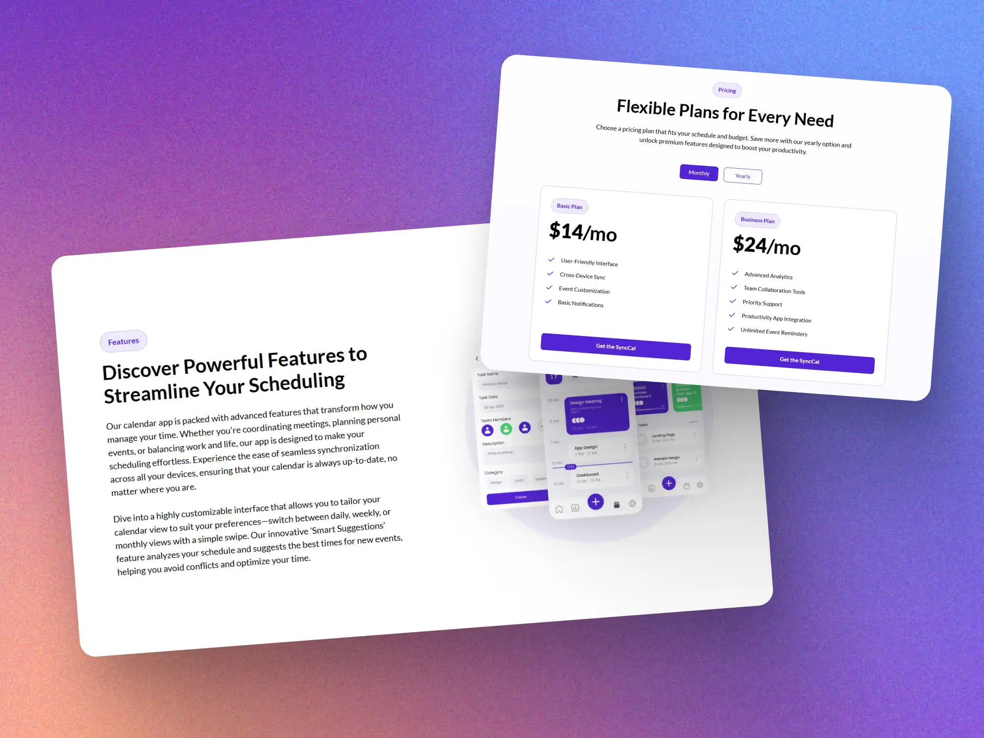 Výzvou pri projekte SynCal bolo vytvoriť efektívnu a pútavú jednostránkovú prezentáciu SaaS produktu za 24 hodín. Museli sme navrhnúť logickú štruktúru stránky, ktorá by návštevníkov previedla kľúčovými informáciami o produkte, vzbudila ich záujem a zároveň poskytla jasnú cenovú ponuku. Ďalej bolo potrebné zabezpečiť, aby bol dizajn moderný, responzívny a optimalizovaný na zobrazenie na rôznych typoch zariadení.